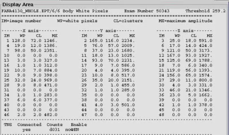 11. GP بورڈ، EPT وائٹ پکسل ہیڈ اور باڈی اسکین پر X،Y اور Z گریڈینٹ ڈرائیو فائبر آپٹکس کو منقطع کریں۔ نتیجہ پاس ہے. یہ اس بات کی نشاندہی کرتا ہے کہ سفید پکسل میلان کی طرف سے حوصلہ افزائی کی جاتی ہے. دیکھا کہ سفید پکسل نہ صرف ایک محور پر موجود ہے۔ پھر SGA PS، GP بورڈ کو تبدیل کریں، لیکن پھر بھی مسئلہ ہے۔ X,Y,Z گریڈینٹ ڈرائیو فائبر آپٹکس کو دوبارہ جوڑیں۔